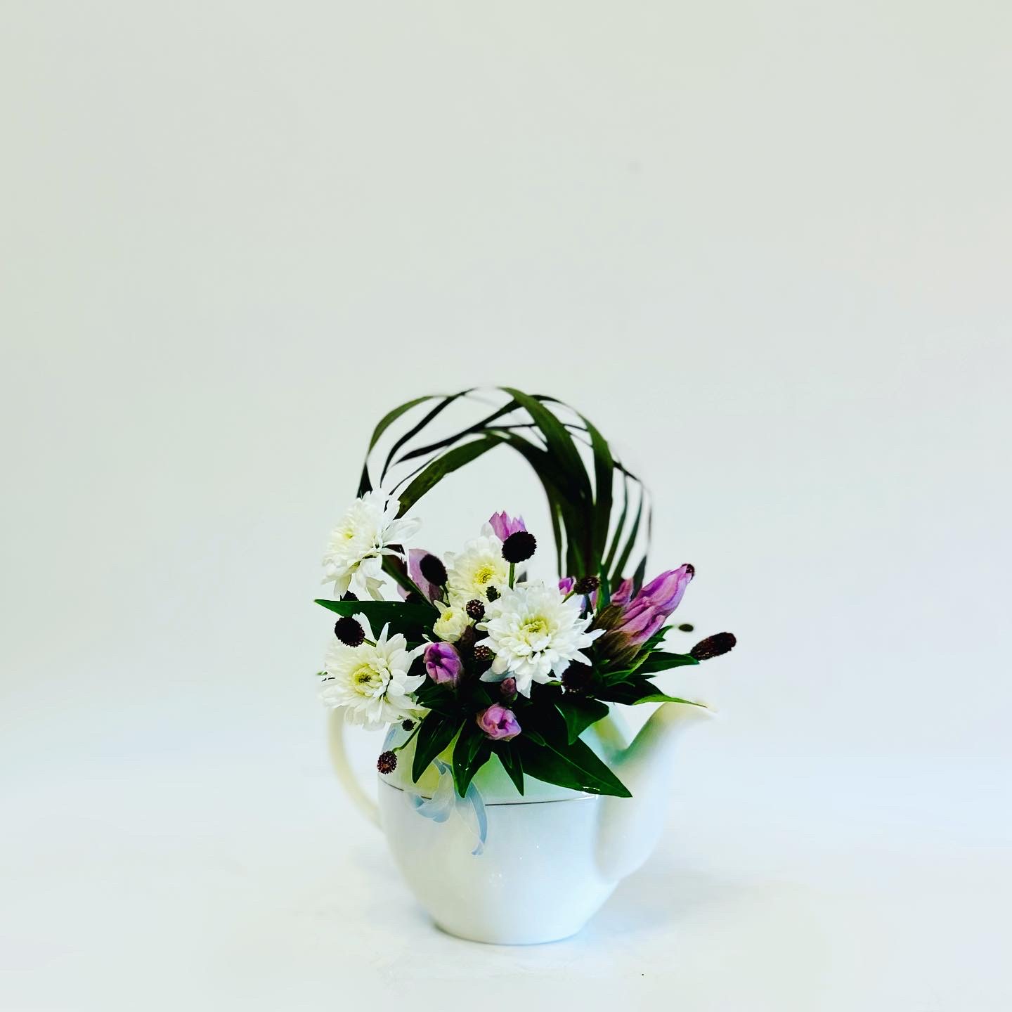Ikebana with Gentian, Spray mum, Burnet & Dracaena in a tea pot for a short break in a autumn holiday