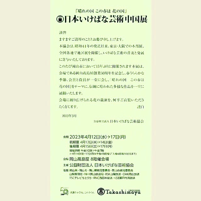 「晴れの国 この春は花の国」をテーマに伝統に培われた多様な作品を一堂に展観いたします